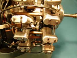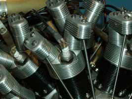 Close up of the cylinder fins, valve towers, enclosed rocker boxes, pushrods, cylinder skirt bolts, spark plug and the ignition wire.